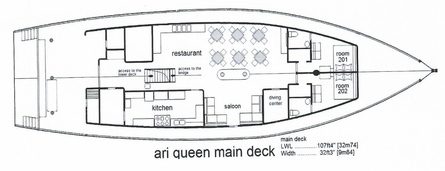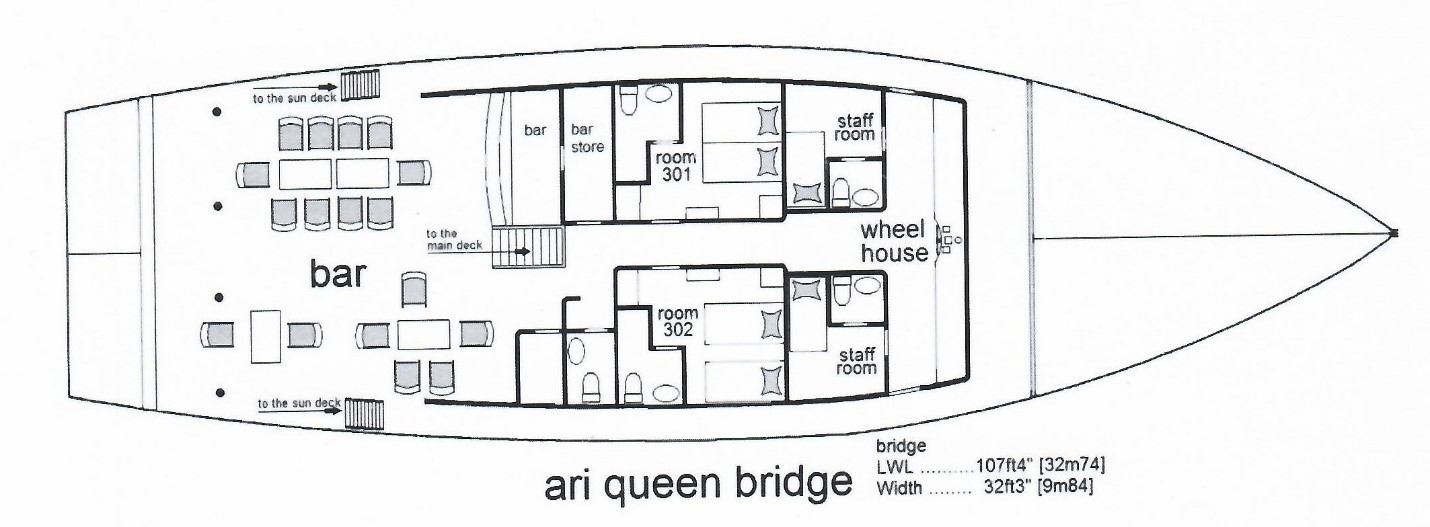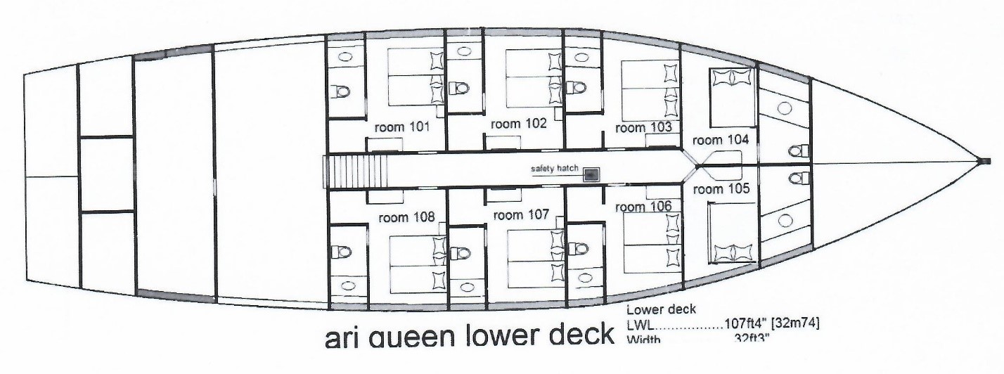Topside the Ari Queen has 12 cabins catering to a maximum of 24 guests. 8 twin cabins on the lower deck feature double and single beds. The main deck has two Deluxe cabins and the upper deck has 2 Suites. The Deluxe and Suites benefit from sea views, small fridge and flat screen TV. All cabins feature individually controlled A/C, warm water showers, wardrobe and storage space.