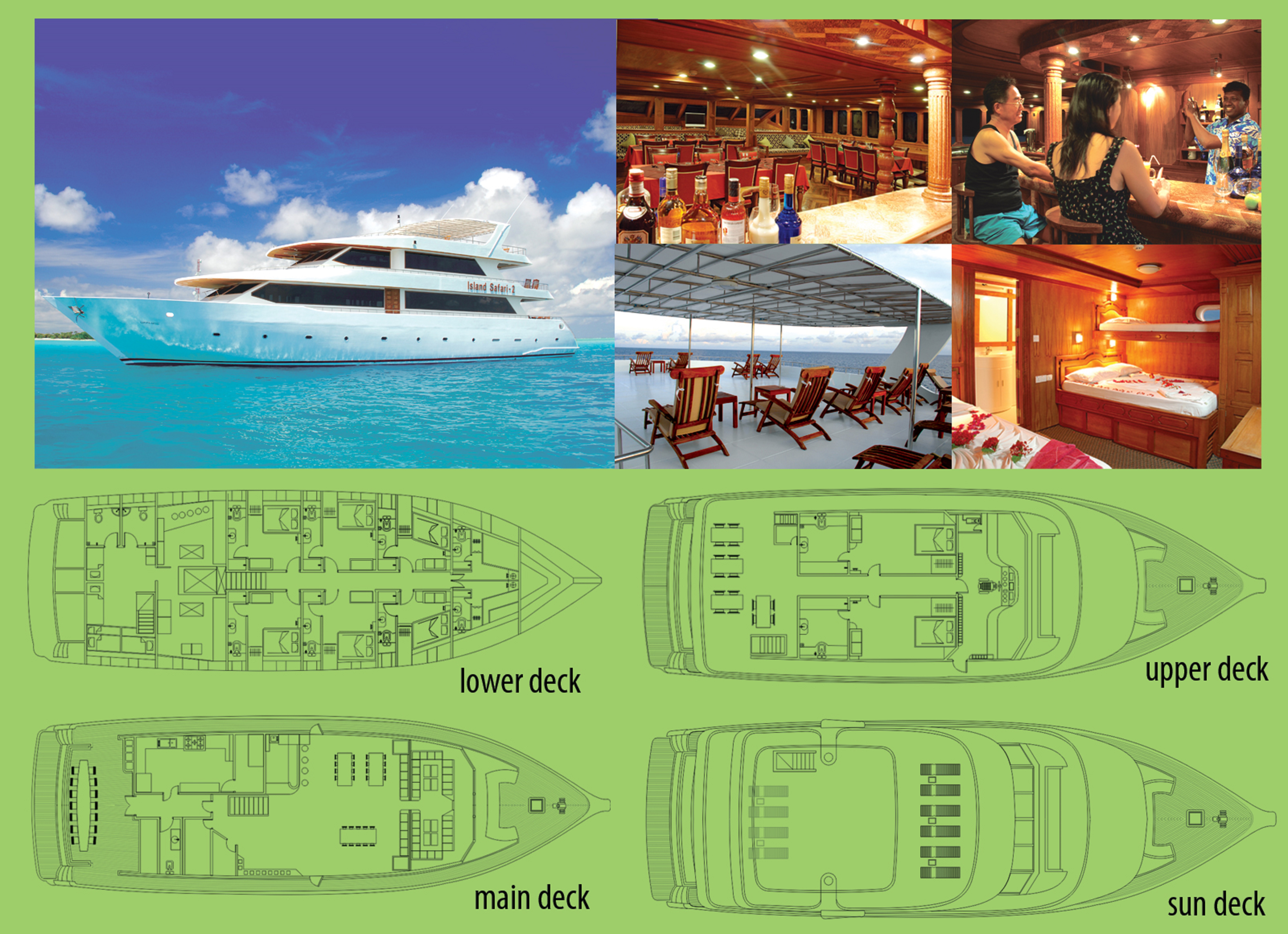 Island safari offers you numerous ways to experience Maldives aboard its fleet of live-aboard safari vessels. A truly unique way to explore and experience the splenders and wonders that the Maldives is - on aboard the Island Safari 1 Deluxe and Island Safari 2 Royal - cruising in class and comfort.