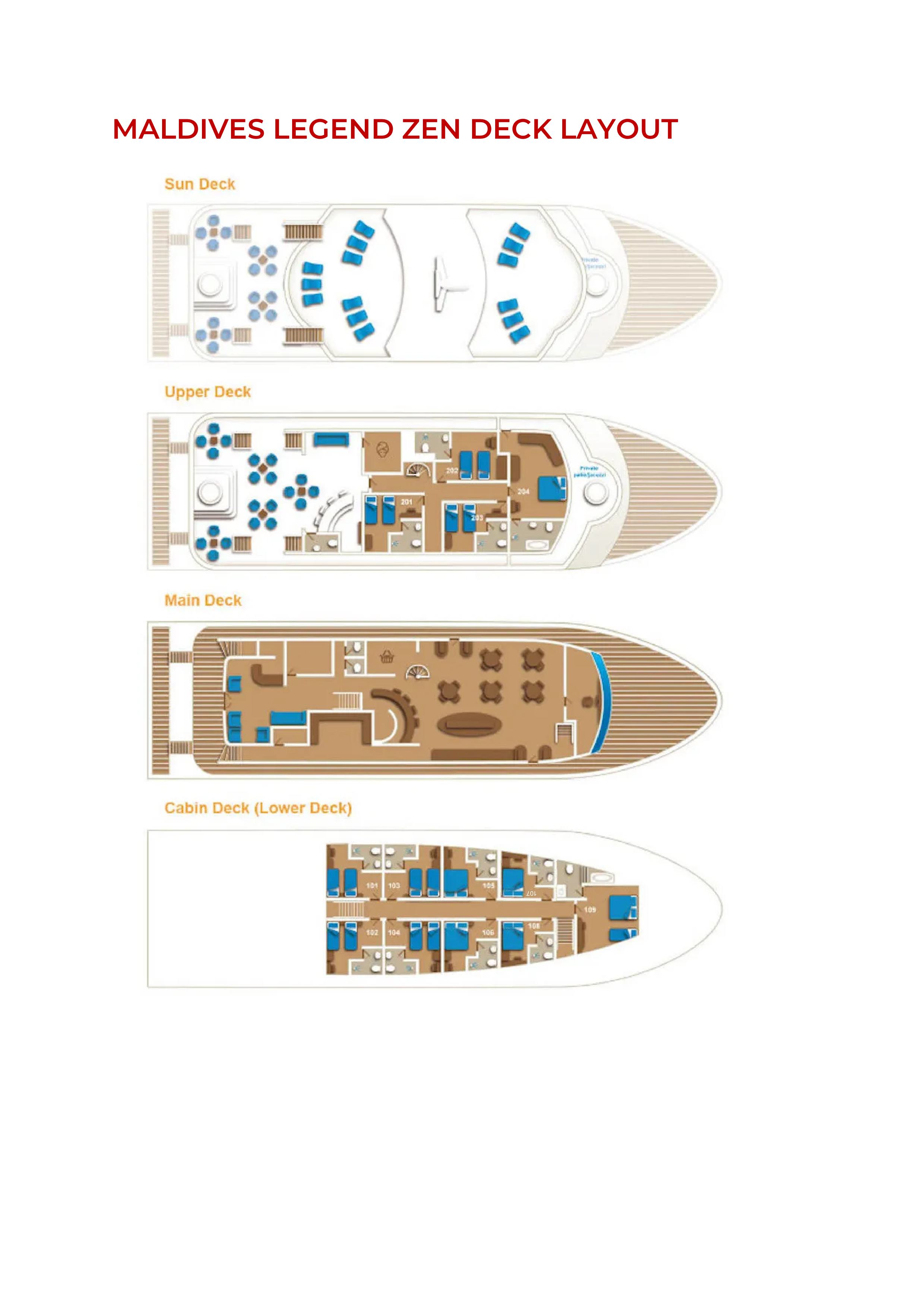 On board Maldives Legend Zen, up to 24 guests are accommodated in 13 cabins of various categories – from a luxurious upper-deck suite with breathtaking panoramic views, a private balcony, and a jacuzzi, to double and single cabins on the lower deck. All cabins are designed in a calm, minimalist style, featuring light wood, soft tones, and an abundance of space and natural light. Each cabin is equipped with individual air-conditioning, an en-suite bathroom with toilet and hot/cold shower, storage space, comfortable beds, and well-designed lighting.