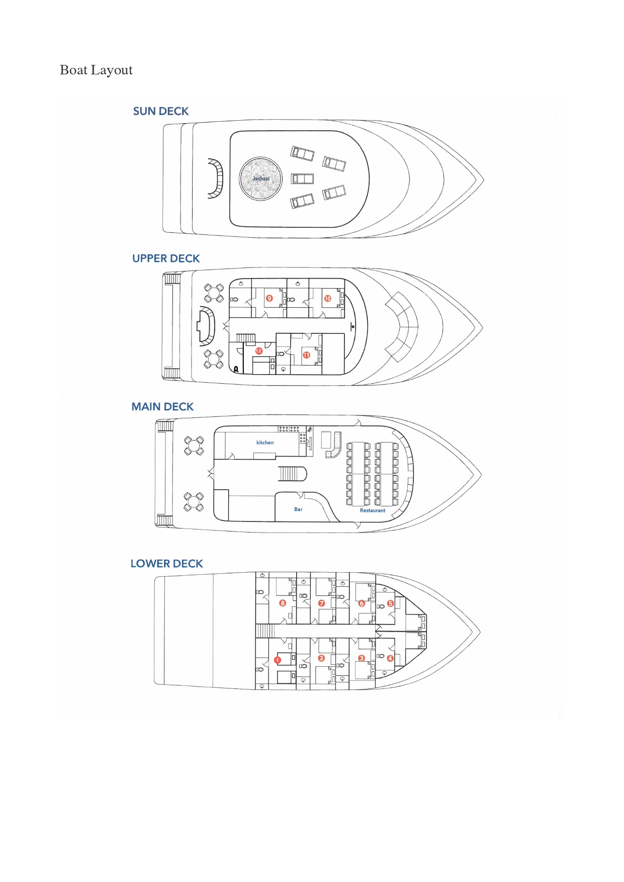Cabins: 11 Cabins in Total: Air Conditioner and Hot & Cold Shower are Available in All Rooms. Lower Deck: 8 Cabins - 2 Deluxe Single (1 Queen Bed) - 1 Deluxe Double (1 King Bed) - 5