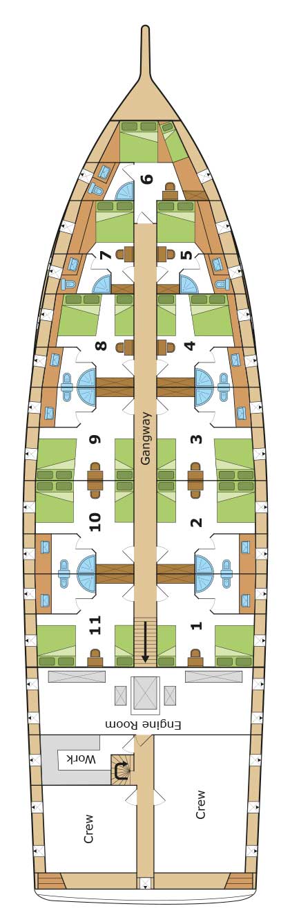 All 12 cabins have identical design and are equipped with a king size double bed and a king single bed. However, the cabins are booked only for double occupancy. Ten of the cabins are located below deck and two on the middle deck.