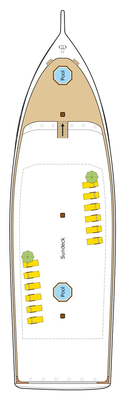 The sun deck of approximately 400 m² offers both open sun and shaded areas under a sail canopy, as well as comfortable sofas where guests often gather to admire the magical Maldivian sunsets.
