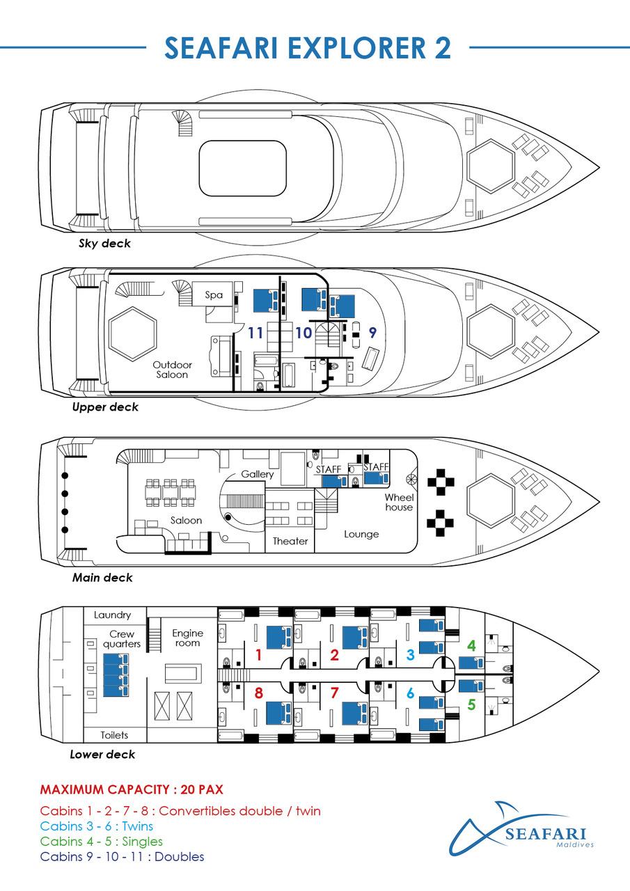 The Seafari Explorer 2 is ready after a complete refurbishment! A very spacious boat with 12 cabins, including 6 on the upper deck. Fully air-conditioned and with all the comforts of the finest dive cruise boats, the boat will surprise you with its interior and exterior spaces and its breathtaking views of the Indian Ocean.