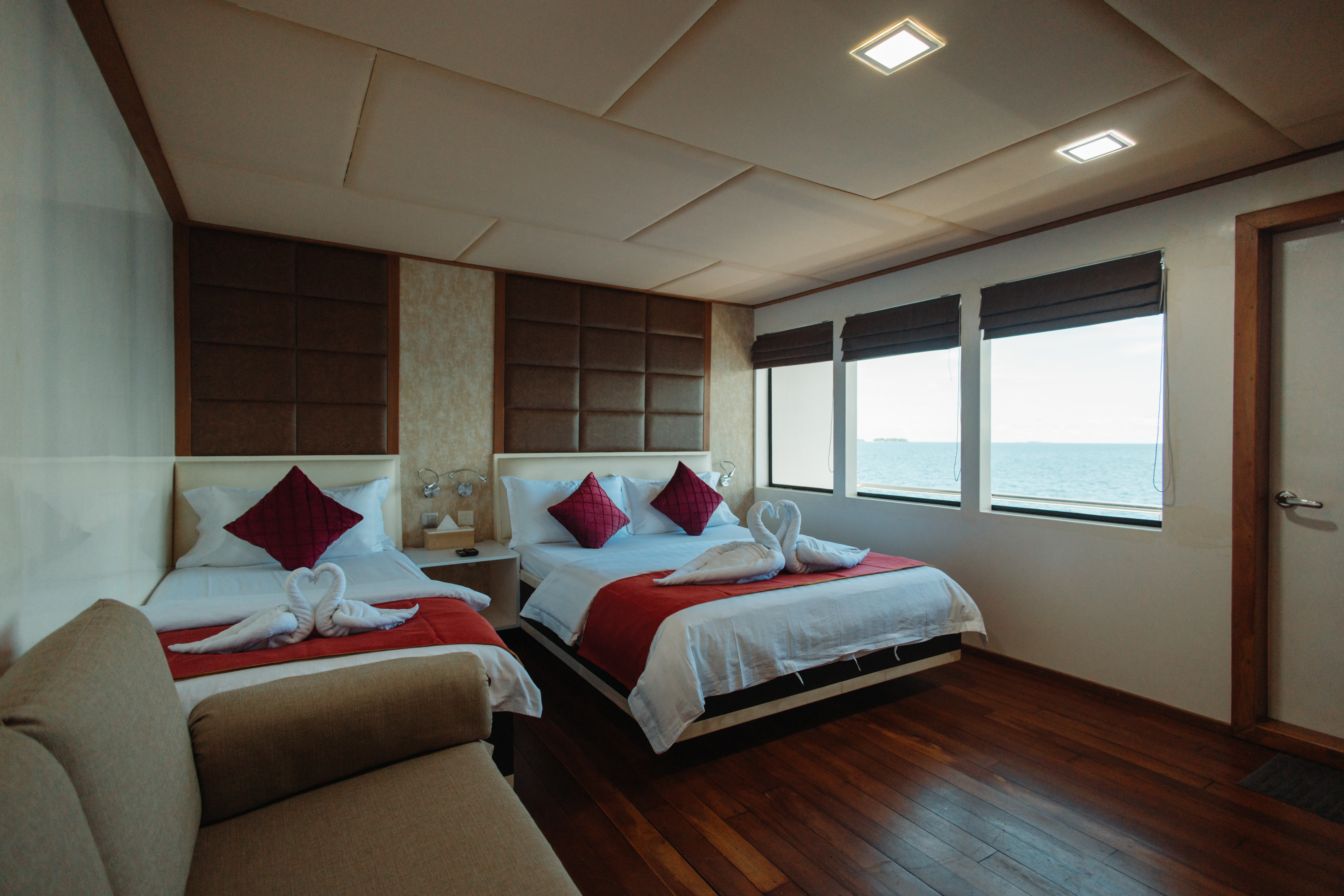 With a length of 37 meters and a width of 10 meters, Adora is designed to make every guest feel as if they are in a first-class hotel, featuring spacious indoor and outdoor relaxation areas. The vessel accommodates 11 fully equipped en-suite cabins with air conditioning across various categories: 4 luxury suites on the third deck with panoramic ocean views and private balconies (each with one double and one single bed), one comfortable superior cabin with a large double bed on the middle deck, and 6 functional standard cabins on the lower deck. Every room is tastefully decorated and equipped with everything necessary for a comfortable stay, including the option for single occupancy, making it an excellent choice for solo travelers. Special attention was paid to soundproofing during the design process, ensuring maximum tranquility during sea crossings and ability to rest in your cabin even when there is lively entertainment in public areas. Attentive friendly staff and delicious, varied cuisine create an atmosphere of warmth and care. While perfectly equipped for diving safaris for up to 21 divers—featuring a spacious dive deck, specialized equipment, Nitrox, and an English-speaking crew—the yacht Adora is also a versatile leisure space. It hosts specialized tours for surfers and yoga enthusiasts, exciting fishing trips, vibrant parties, and social cruises.The experience extends beyond the boat with cozy picnics on uninhabited islands, barbecues under the stars, and thrilling night fishing. In the evenings, the deck becomes a focal point as powerful LED lighting attracts majestic mantas and sharks to the platform, creating a backdrop for unforgettable photos.