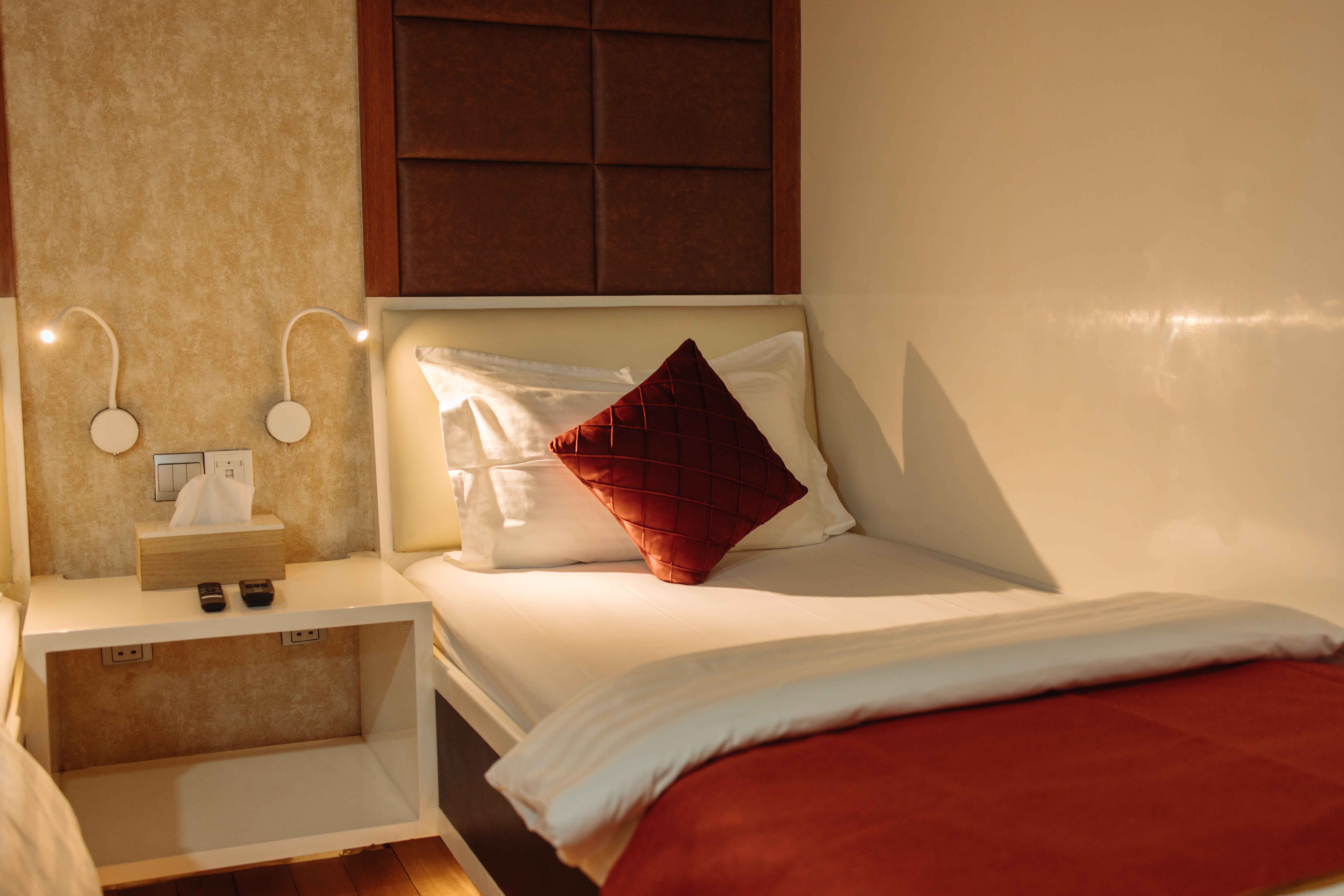 - Accommodation in air-conditioned cabins with outside window, en-suite bathroom (hot water), towels and room service