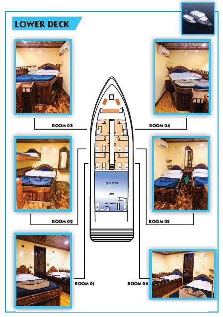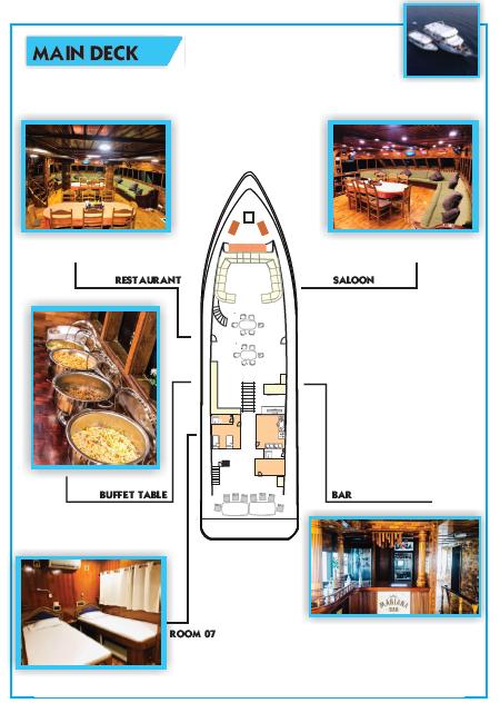 The main deck offers a fan cooled dinning room and saloon area, equipped with comfortable sofas and chairs, and a cosy bar offering a range of drinks including bee, wine and imported sprits. You will also find audio, DVD and TV / Video equipment. Mariana’s kitchen provides a variety of European, Asian and Maldivian dishes. Three meals a day are served including tea and coffee. A BBQ is also organised on an ininhabited island.