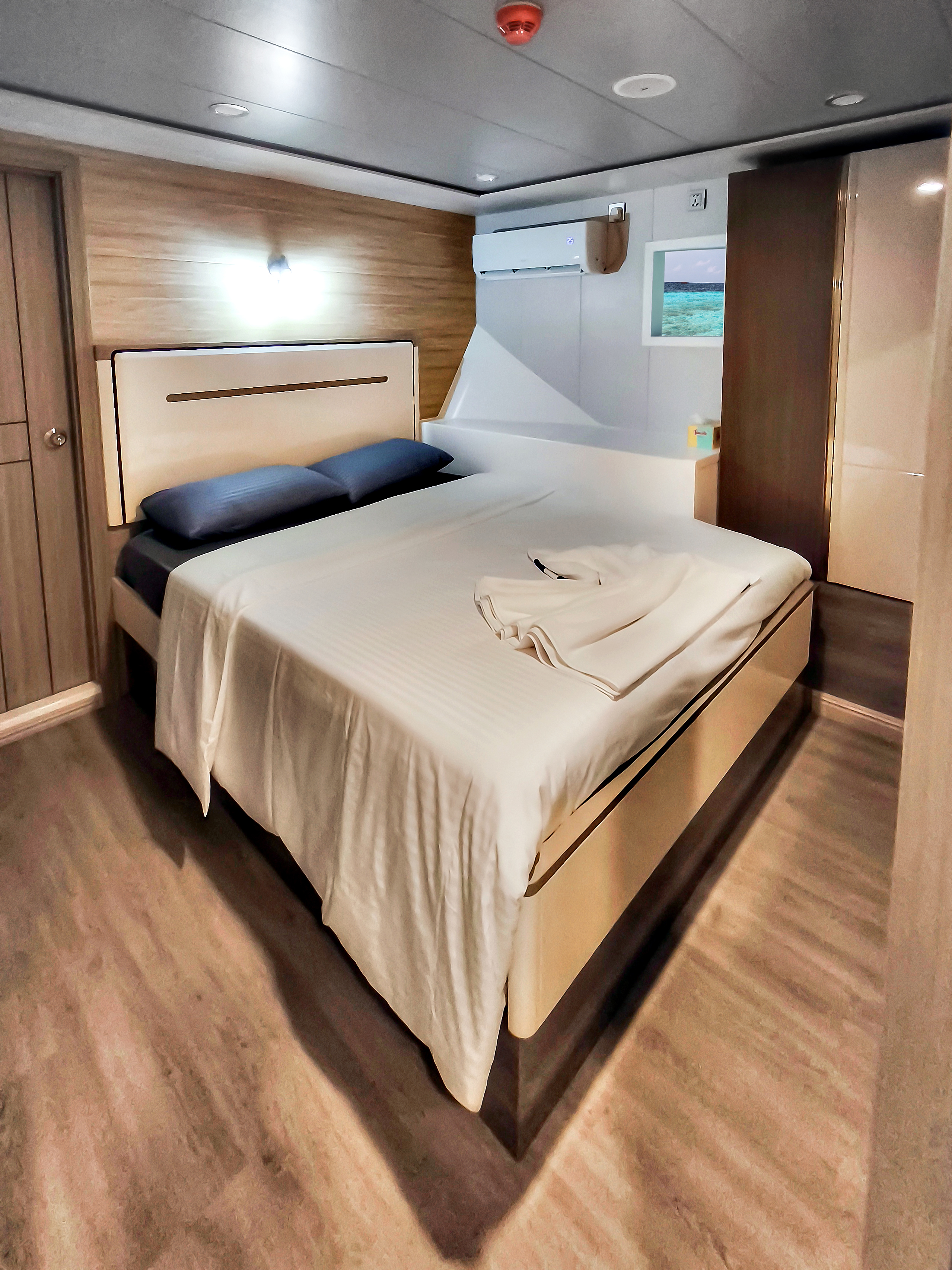 Standard comfortable cabins on the upper deck with ocean views. Double bed (200 x 180 cm) + single bed (200 x 90 cm)