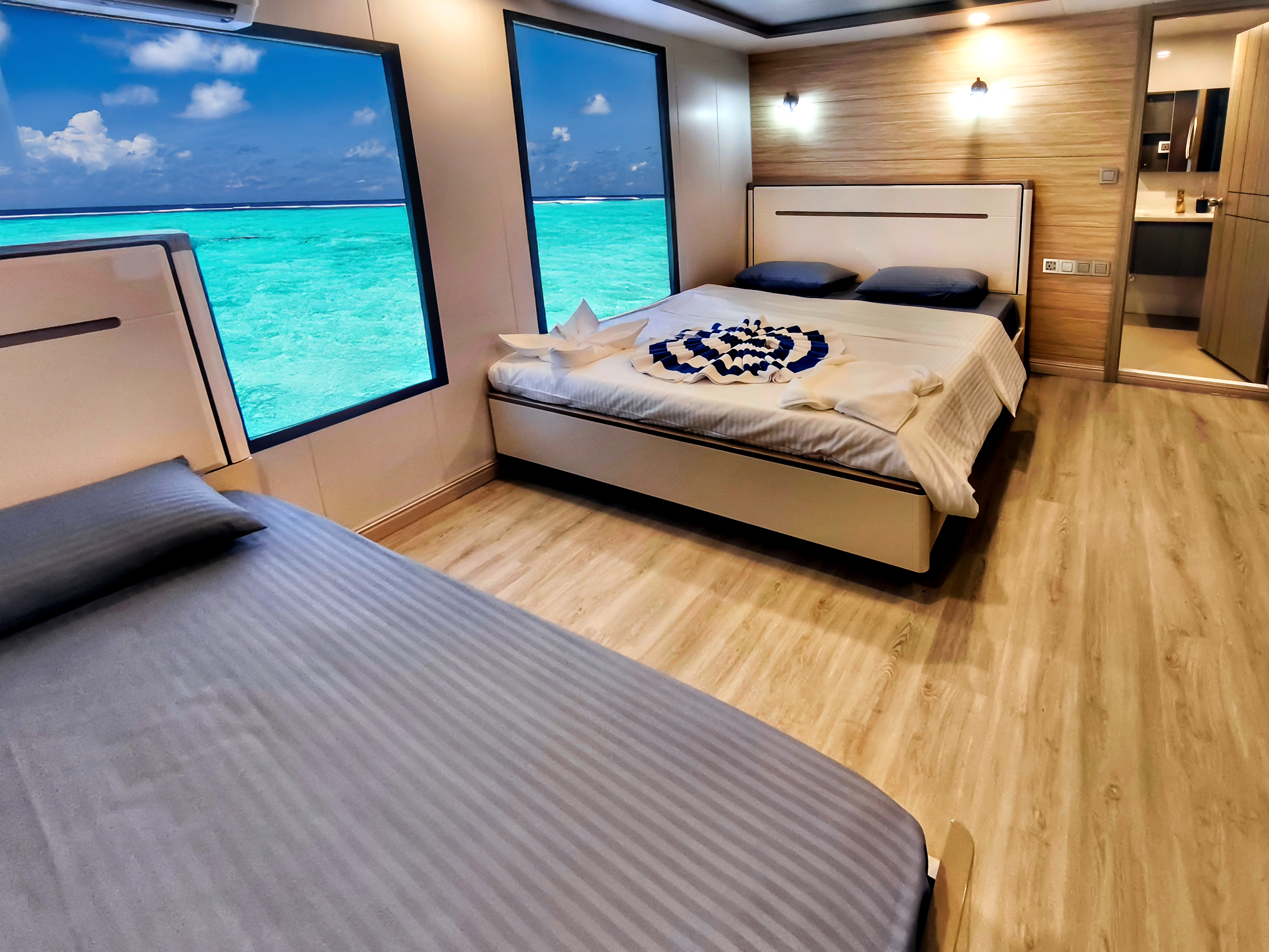 The yacht measures 40 meters in length and 13 meters in width, and its powerful engines ensure smooth and confident cruising between the atolls. On board, you’ll find 13 cabins of various categories — from cozy standards to luxurious suites with panoramic views. All cabins are equipped with air conditioning and private bathrooms, offering ideal comfort after a full day beneath the waves.