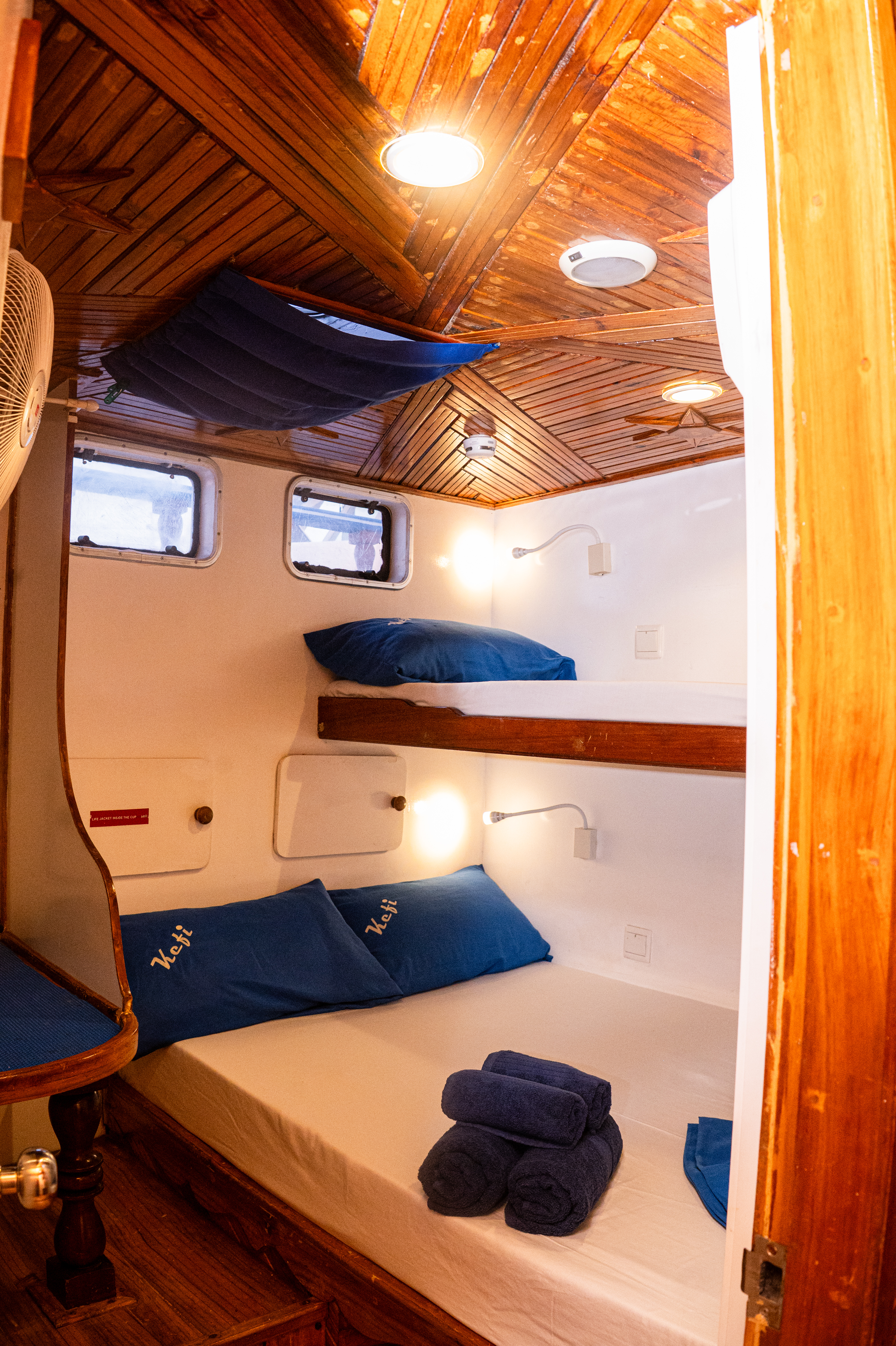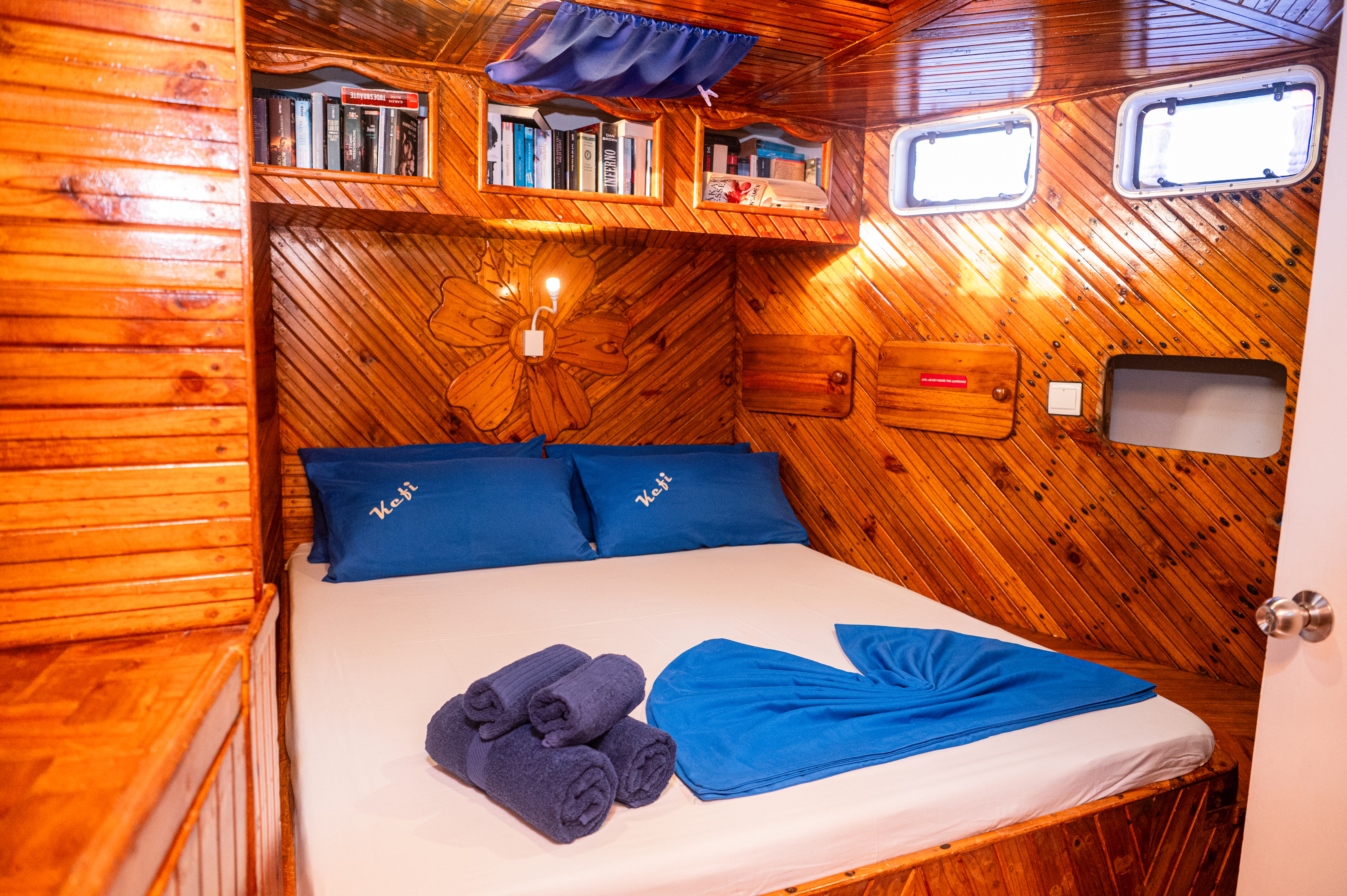Kefi has only 5 cabins for a maximum of 10 guests, and that's the secret to its magic. There are no crowds, no noise. Instead, you can enjoy morning coffee overlooking a tranquil lagoon, dive into the ocean straight from the deck, chat under the stars after a night dive, and feel like the entire archipelago is yours alone. All cabins are air-conditioned and feature en- suite bathrooms, carved wooden panels, and panoramic portholes.